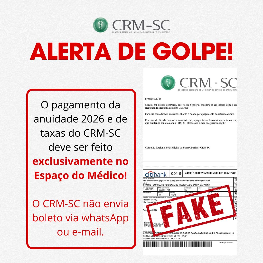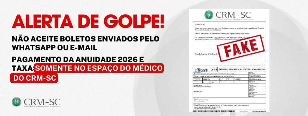 Anuidade CRM-SC 2026: Pagamento somente pelo Espaço do Médico. Evite Golpe! O CRM-SC não envia boleto bancário ou link para pagamento, através do WhatsApp ou e-mail. É GOLPE.Continue Lendo