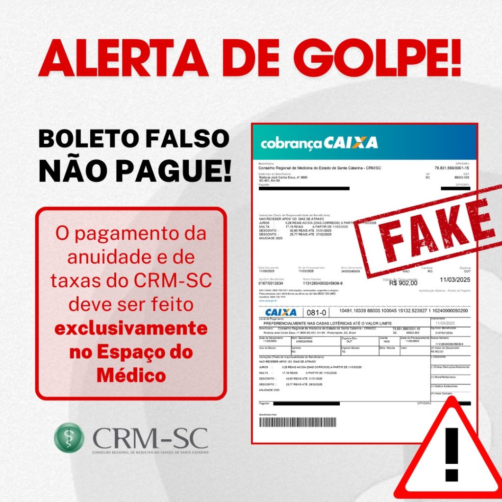 O CRM-SC e o CFM fazem alerta para mais um golpe que está sendo aplicado contra médicos. Criminosos têm entrado em contato através do WhatsApp, alegando a existência de pendências no Conselho. Nesta mensagem consta o link para a emissão do boleto.
