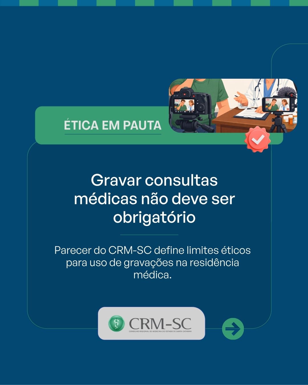 O CRM-SC aprovou parecer que esclarece os limites éticos e legais para a gravação de consultas médicas no âmbito de programas de residência. O documento aprovado pelos conselheiros conclui que não há amparo ético nem legal para tornar obrigatória a gravação de atendimentos realizados por médicos residentes, mesmo quando destinada a fins didáticos.