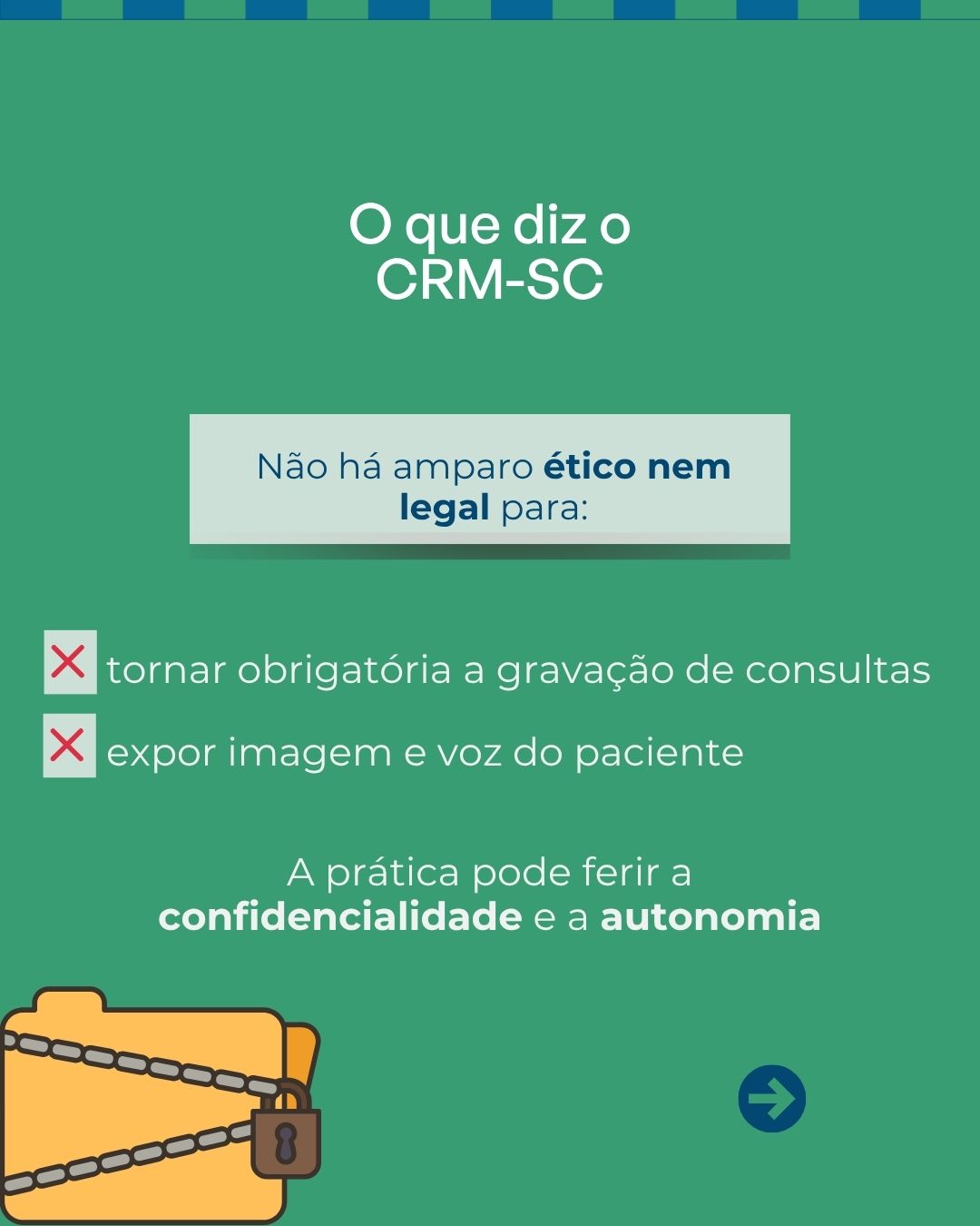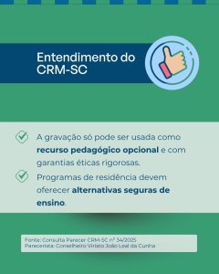 Como conclusão, o CRM-SC estabelece que a gravação de consultas pode ser admitida apenas como recurso pedagógico facultativo, desde que sejam garantidos o consentimento específico, o anonimato, o acesso restrito, o armazenamento seguro e o descarte adequado dos dados, sob responsabilidade da instituição formadora. O parecer também recomenda que programas de residência adotem alternativas pedagógicas equivalentes, como simulações e metodologias estruturadas de avaliação clínica.