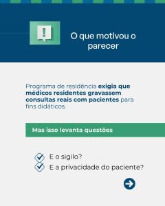 A manifestação foi motivada por consulta de um médico residente que relatou a exigência, em atividade curricular, de gravação em vídeo e áudio de consultas reais com pacientes. O material seria posteriormente apresentado em encontros educacionais, com exposição da imagem e da voz dos pacientes, o que levantou questionamentos sobre a preservação do anonimato e o risco de constrangimento.