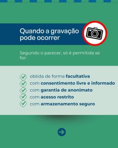 O parecer também considera a Lei Geral de Proteção de Dados (LGPD), que classifica informações de saúde como dados sensíveis e exige tratamento com finalidade específica, segurança e consentimento destacado. Nesse contexto, a gravação de consultas só pode ocorrer com justificativa ética clara e mediante autorização livre e informada do paciente, sem qualquer tipo de imposição.