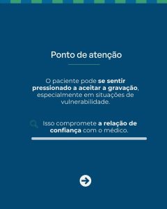 Outro ponto destacado é o risco de consentimento viciado, especialmente quando o paciente se sente pressionado a aceitar a gravação por receio de prejuízo no atendimento. Para o Conselho, esse cenário compromete a autonomia do paciente e fragiliza a relação de confiança entre médico e paciente, um dos pilares da prática médica.