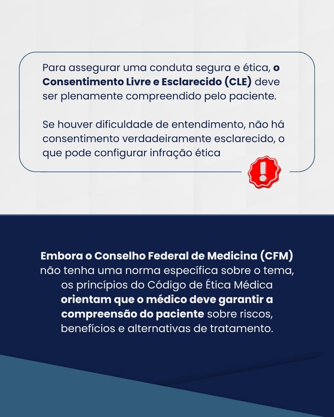 Segundo o parecer, embora não exista uma resolução específica do Conselho Federal de Medicina (CFM) que trate exclusivamente das barreiras linguísticas, os princípios éticos que regem a profissão são aplicáveis. O médico tem o dever de garantir que o paciente compreenda os riscos, benefícios e alternativas do tratamento, e de assegurar sua liberdade para aceitar ou recusar as condutas propostas.