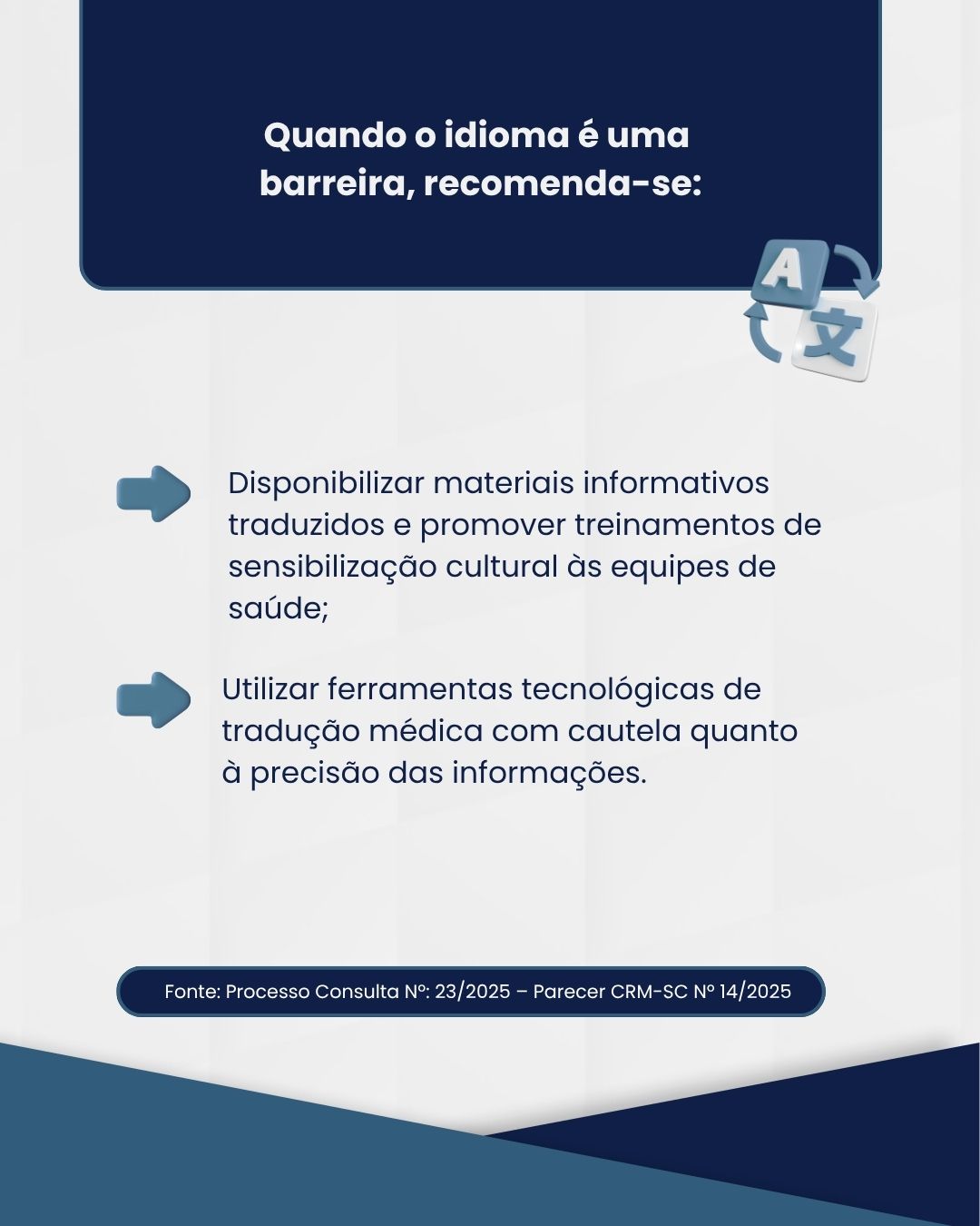 O CRM-SC considera recomendável a presença de intérprete qualificado — profissional ou voluntário treinado — sempre que houver barreira de comunicação. O uso de familiares ou crianças como intérpretes deve ser evitado, salvo em situações de emergência.