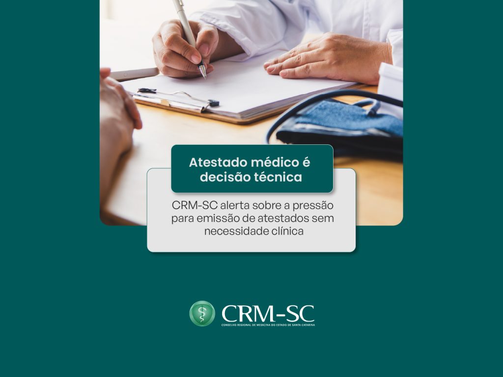 O Conselho Regional de Medicina de Santa Catarina (CRM-SC) manifesta preocupação com a intensificação de situações em que médicos estão sendo pressionados a emitir atestados que extrapolam a real necessidade identificada após a avaliação clínica direta do paciente. O cenário, cada vez mais frequente nos consultórios, serviços de urgência e unidades de saúde, acende um alerta não apenas para a categoria médica, mas para toda a sociedade.