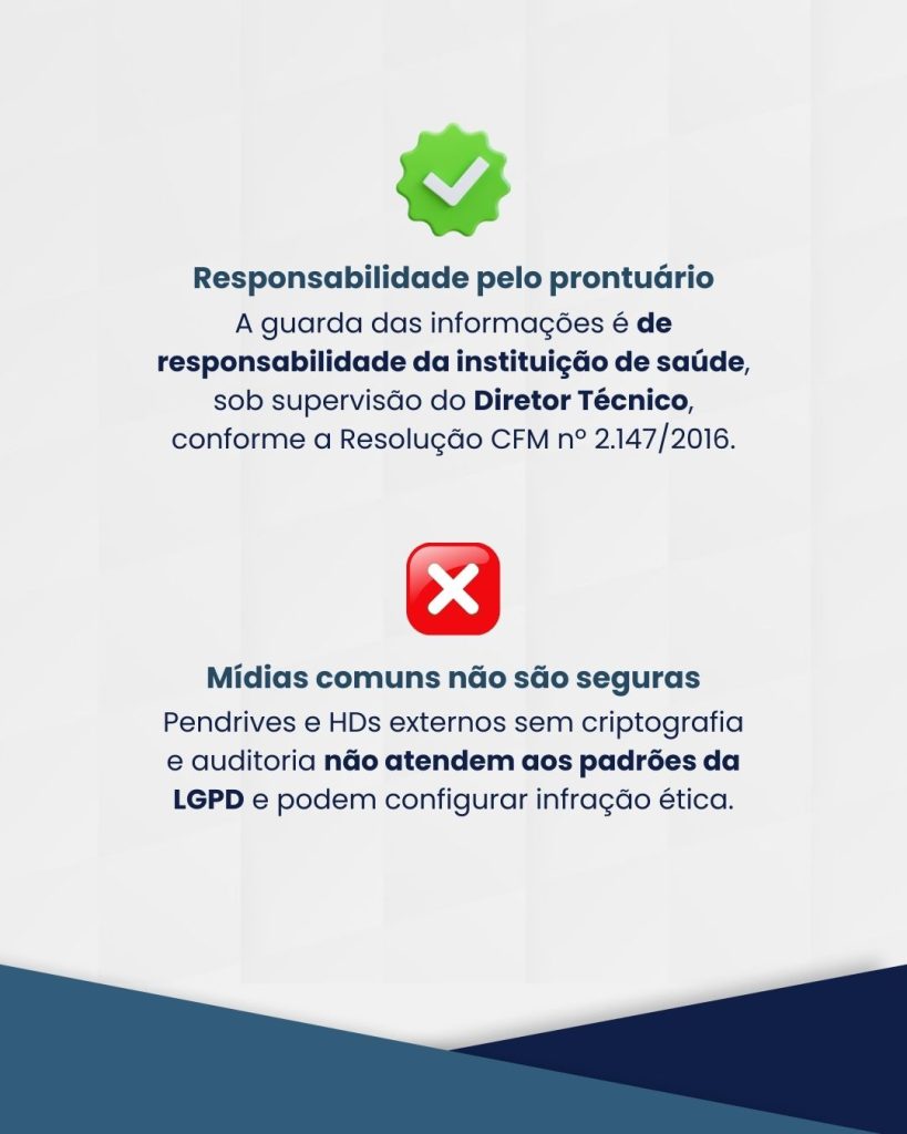 A responsabilidade pela guarda e gestão dos prontuários, reforça o parecer, é da instituição de saúde, sob supervisão do diretor técnico. Qualquer liberação de cópia ou manipulação de dados deve seguir três requisitos essenciais: consentimento expresso do paciente, autorização formal da instituição e garantias técnicas de segurança da informação.