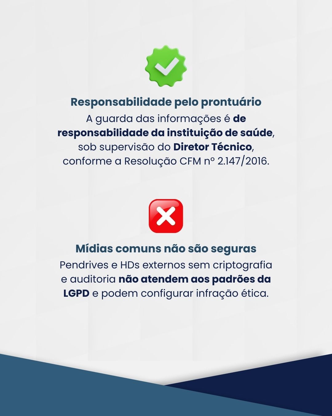 O Conselho também alerta sobre o uso de mídias sem o padrão Nível de Garantia de Segurança 2 (NGS2), previsto no Manual de Certificação para Sistemas de Registro Eletrônico em Saúde (S-RES), elaborado pelo CFM e pela SBIS. Sem esse nível de segurança – que inclui autenticação forte, criptografia e auditoria de acessos – há risco concreto de extravio, violação de informações e responsabilização ética e legal do profissional e da instituição.