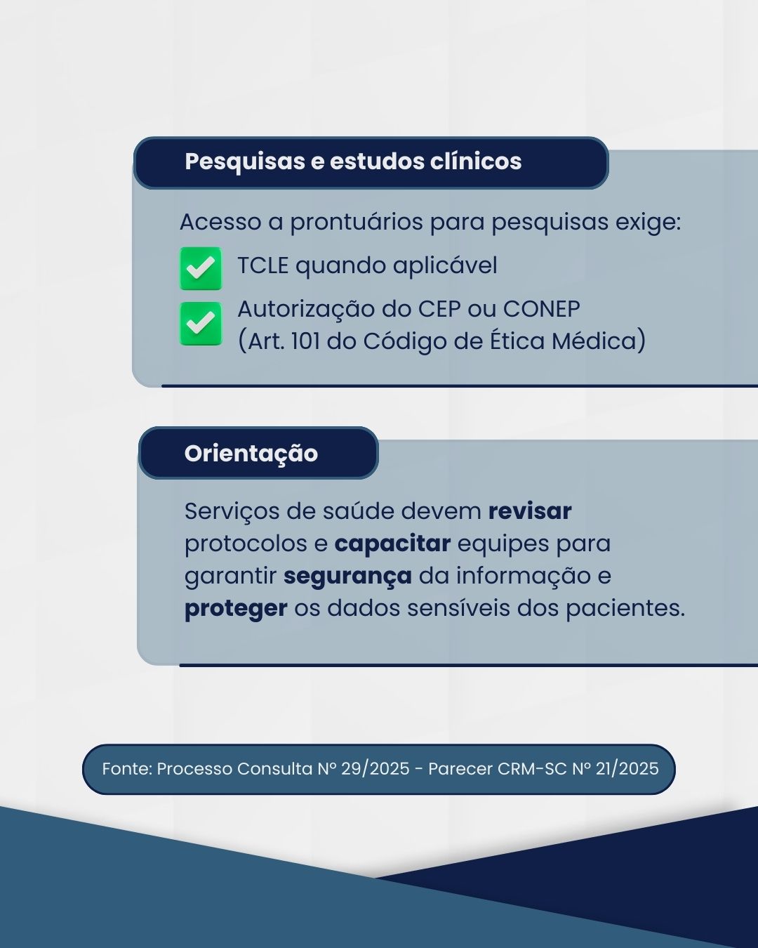 Para situações que envolvam ensino, pesquisa ou estudos retrospectivos, o parecer reforça que o acesso aos prontuários exige autorização prévia do Comitê de Ética em Pesquisa (CEP) ou da Comissão Nacional de Ética em Pesquisa (CONEP), conforme determina o artigo 101 do Código de Ética Médica.