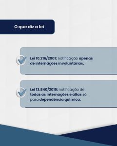 De acordo com o parecer, a Lei nº 11.343/2006, modificada pela Lei nº 13.840/2019, determina que todas as internações e altas sejam comunicadas às autoridades competentes somente quando se tratar de pacientes diagnosticados como dependentes químicos. Fora dessa situação, não há previsão legal que obrigue o médico a notificar internações voluntárias de pacientes com outros tipos de transtornos mentais.