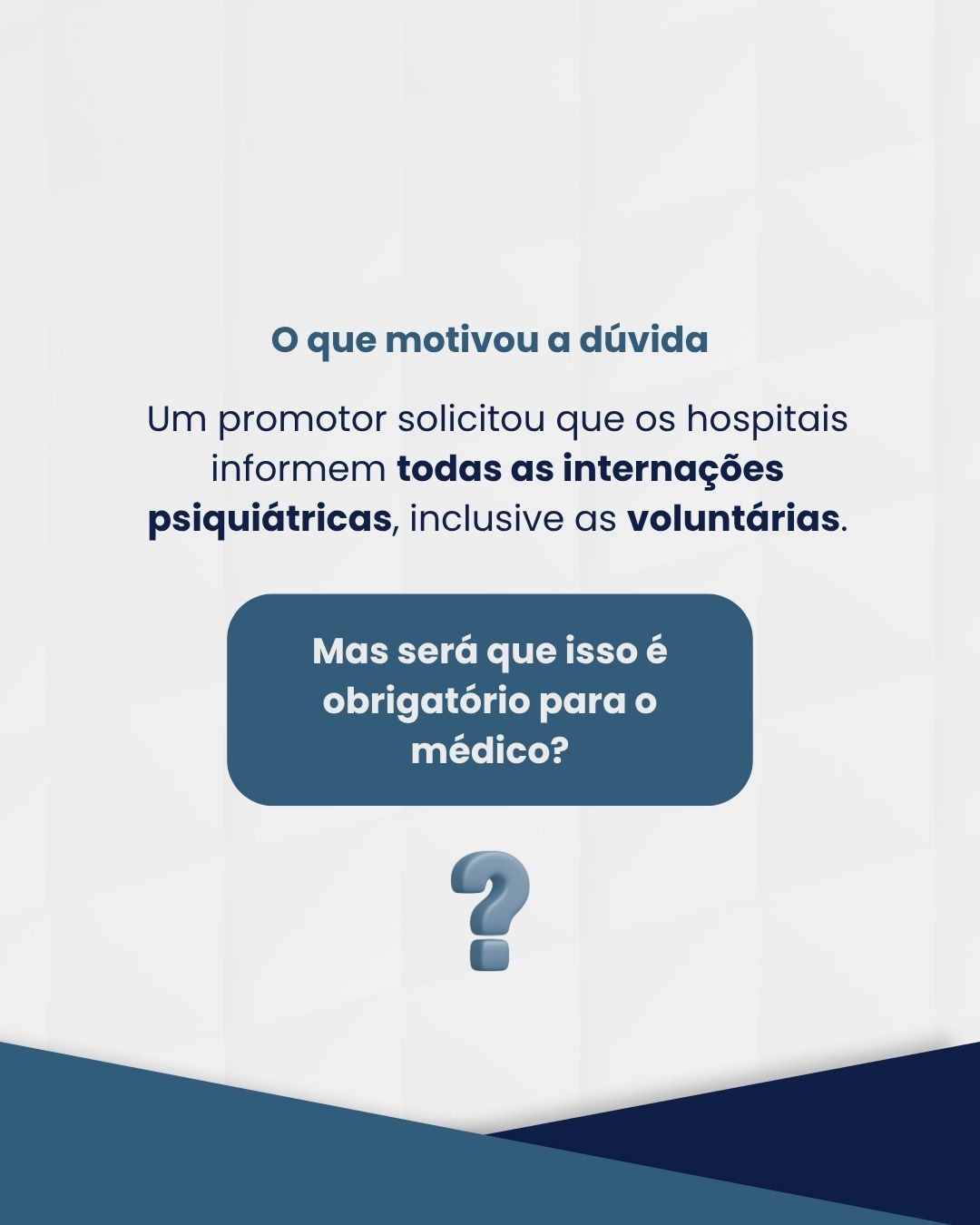 O documento também cita a Resolução CFM nº 2.057/2013, que disciplina a prática psiquiátrica no Brasil e define os tipos de internação — voluntária, involuntária e compulsória — conforme a Lei nº 10.216/2001, conhecida como Lei da Reforma Psiquiátrica. Segundo a norma, apenas as internações involuntárias (sem consentimento do paciente) devem ser comunicadas ao Ministério Público em até 72 horas.