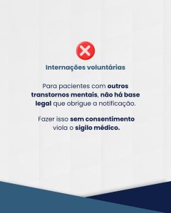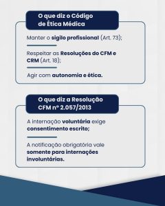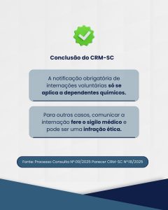 Em síntese, o CRM-SC reforça que a comunicação compulsória de internações voluntárias viola o sigilo médico e não tem respaldo legal, podendo o profissional que a fizer responder eticamente por infração aos artigos 18 e 73 do Código de Ética Médica.