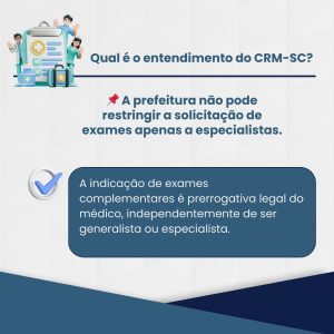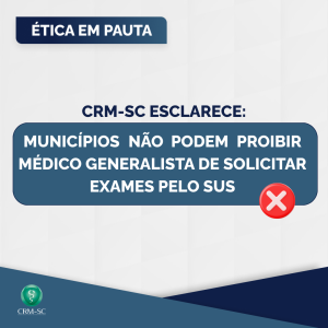O Conselho Regional de Medicina de Santa Catarina (CRM-SC) aprovou parecer que esclarece a ilegalidade de protocolos municipais que restrinjam a solicitação de exames pelo Sistema Único de Saúde (SUS) exclusivamente a médicos especialistas, impedindo que médicos generalistas das Unidades Básicas de Saúde (UBS) e da Estratégia Saúde da Família (ESF) realizem tais requisições.