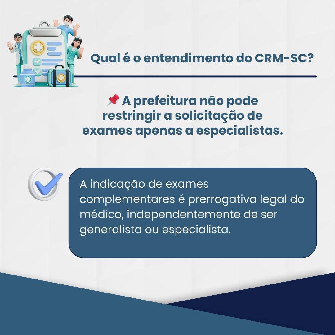 Em síntese, o CRM-SC conclui que uma prefeitura não pode restringir a solicitação de exames apenas a especialistas, devendo garantir a organização da rede sem violar a autonomia profissional do médico generalista nem o direito do cidadão ao acesso integral aos serviços do SUS.