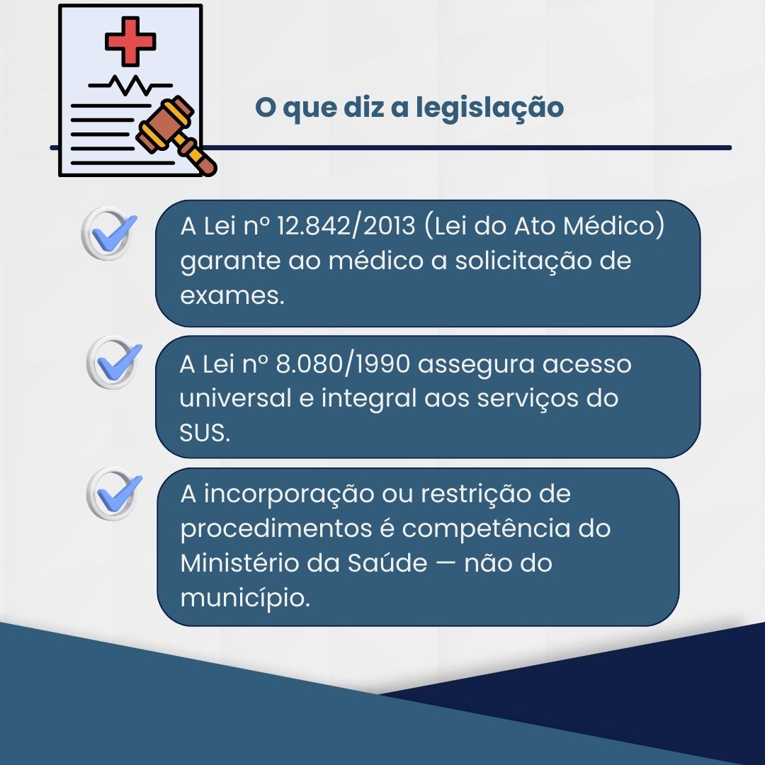 Outro fundamento central é a Lei nº 12.842/2013 (Lei do Ato Médico), que estabelece como atividade privativa do médico a indicação e solicitação de exames complementares, sem distinguir generalistas de especialistas. Assim, todo médico regularmente inscrito no CRM possui prerrogativa legal para requisitar exames, conforme sua avaliação clínica e responsabilidade técnica.
