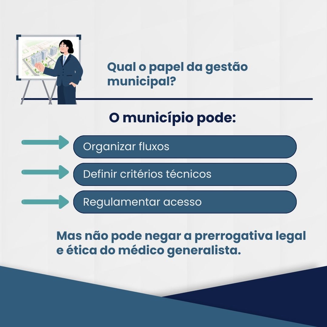 De acordo com o parecer, cabe ao município organizar fluxos administrativos e definir critérios técnicos de acesso, mas não pode suprimir prerrogativas profissionais asseguradas em lei. Eventuais protocolos internos devem respeitar a legislação federal e não podem criar limitações que comprometam a integralidade da assistência.