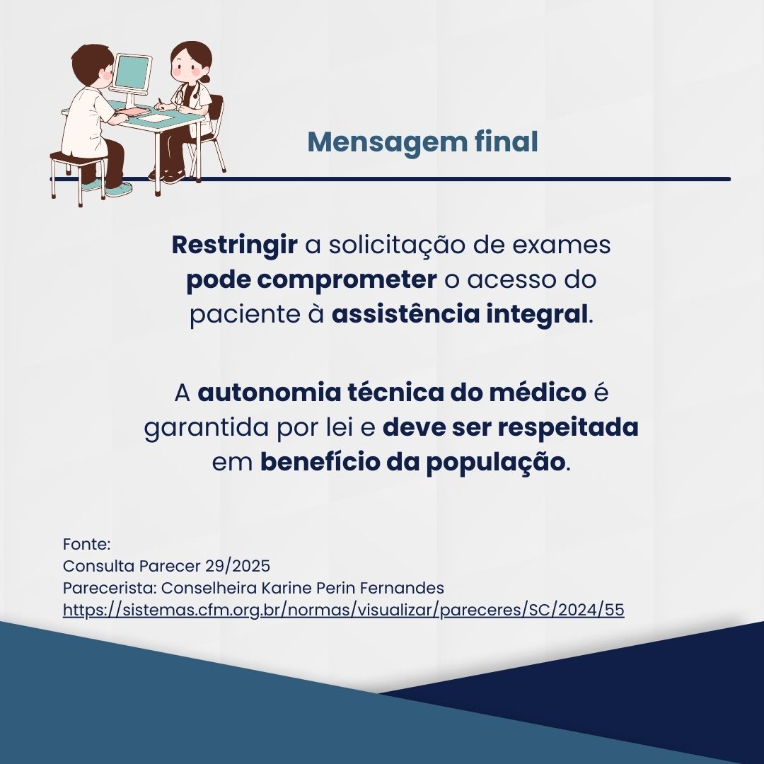O Conselho Regional de Medicina de Santa Catarina (CRM-SC) aprovou parecer que esclarece a ilegalidade de protocolos municipais que restrinjam a solicitação de exames pelo Sistema Único de Saúde (SUS) exclusivamente a médicos especialistas, impedindo que médicos generalistas das Unidades Básicas de Saúde (UBS) e da Estratégia Saúde da Família (ESF) realizem tais requisições.