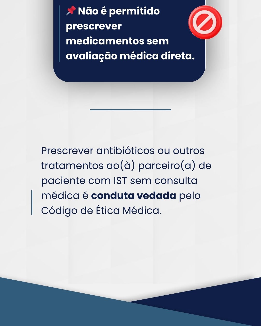 De acordo com o parecer, embora o tratamento dos parceiros seja importante para interromper a cadeia de transmissão das IST, essa recomendação não dispensa a avaliação médica individualizada. O Código de Ética Médica proíbe a prescrição sem exame direto do paciente, exceto em situações excepcionais, como urgência ou impossibilidade comprovada de atendimento imediato.