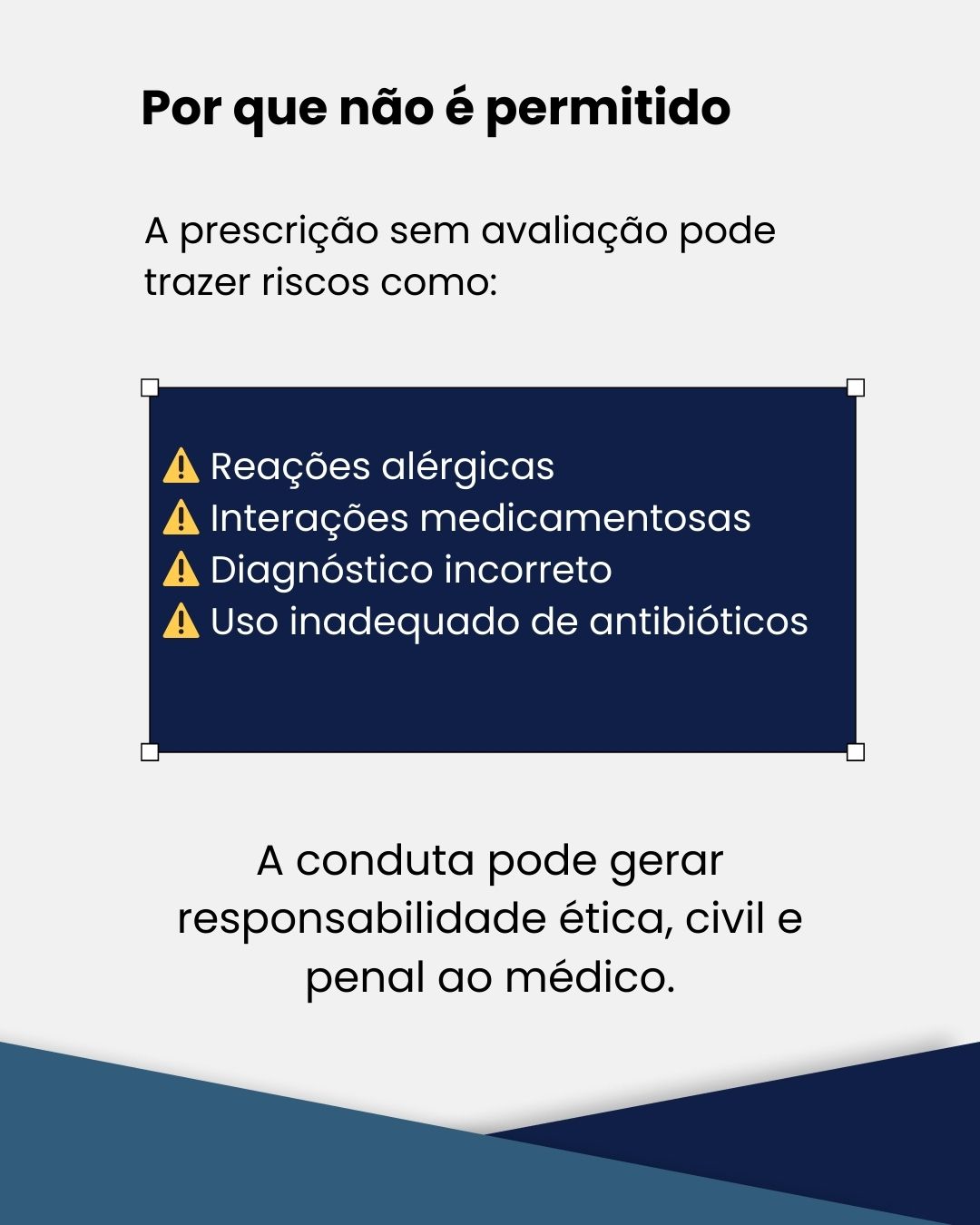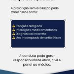 O CRM-SC ressalta que a prescrição sem consulta pode expor o paciente a riscos como reações adversas, alergias, interações medicamentosas e uso inadequado de antibióticos. Além disso, o médico que prescreve sem conhecer o histórico clínico do paciente pode responder nas esferas ética, civil e penal por eventuais danos.