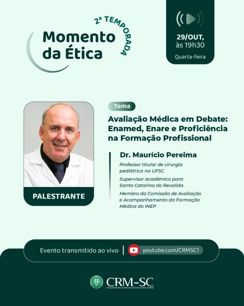 Nesta edição, o tema em debate será “Avaliação Médica em Debate: Enamed, Enare e Proficiência na Formação Profissional”, com transmissão ao vivo pelo canal da autarquia no YouTube (youtube.com/CRMSC01), a partir das 19h30.