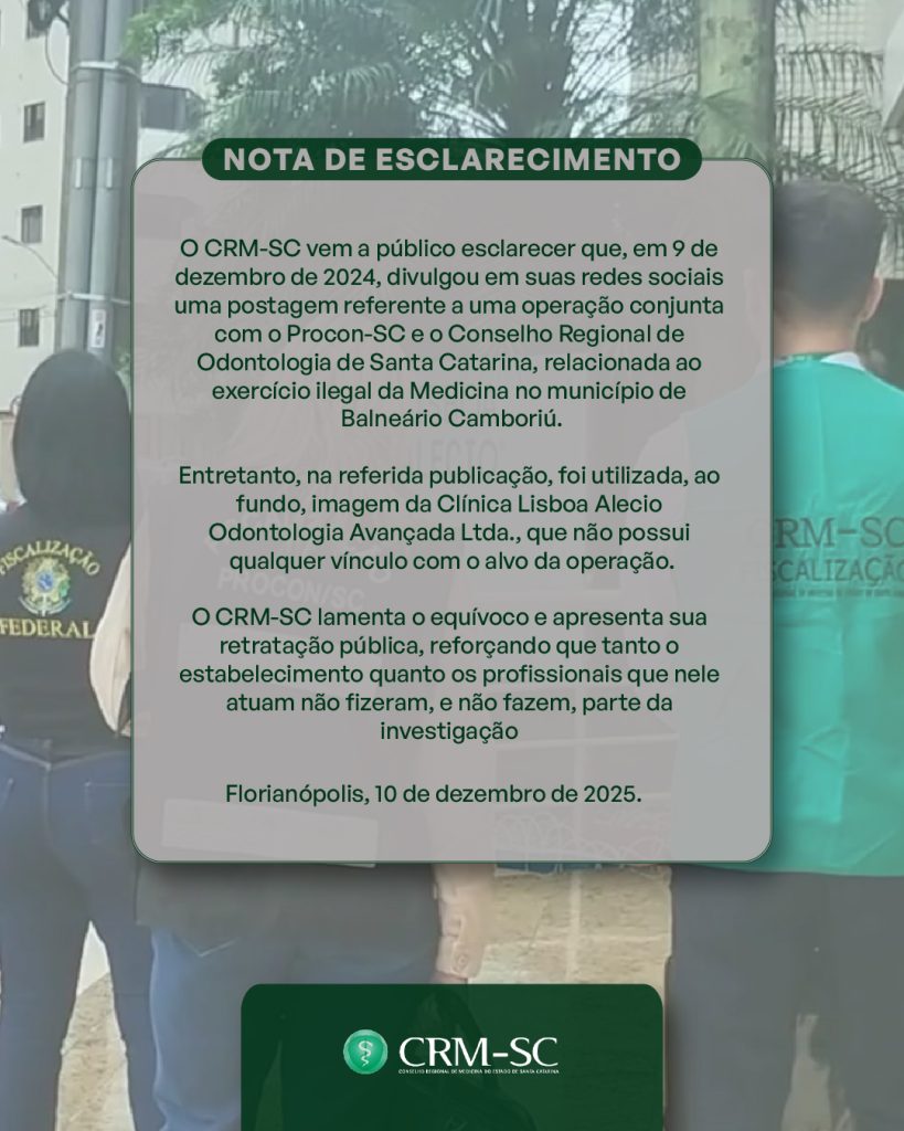 O CRM-SC vem a público esclarecer que, em 9 de dezembro de 2024, divulgou em suas redes sociais uma postagem referente a uma operação conjunta com o Procon-SC e o Conselho Regional de Odontologia de Santa Catarina, relacionada ao exercício ilegal da Medicina no município de Balneário Camboriú.