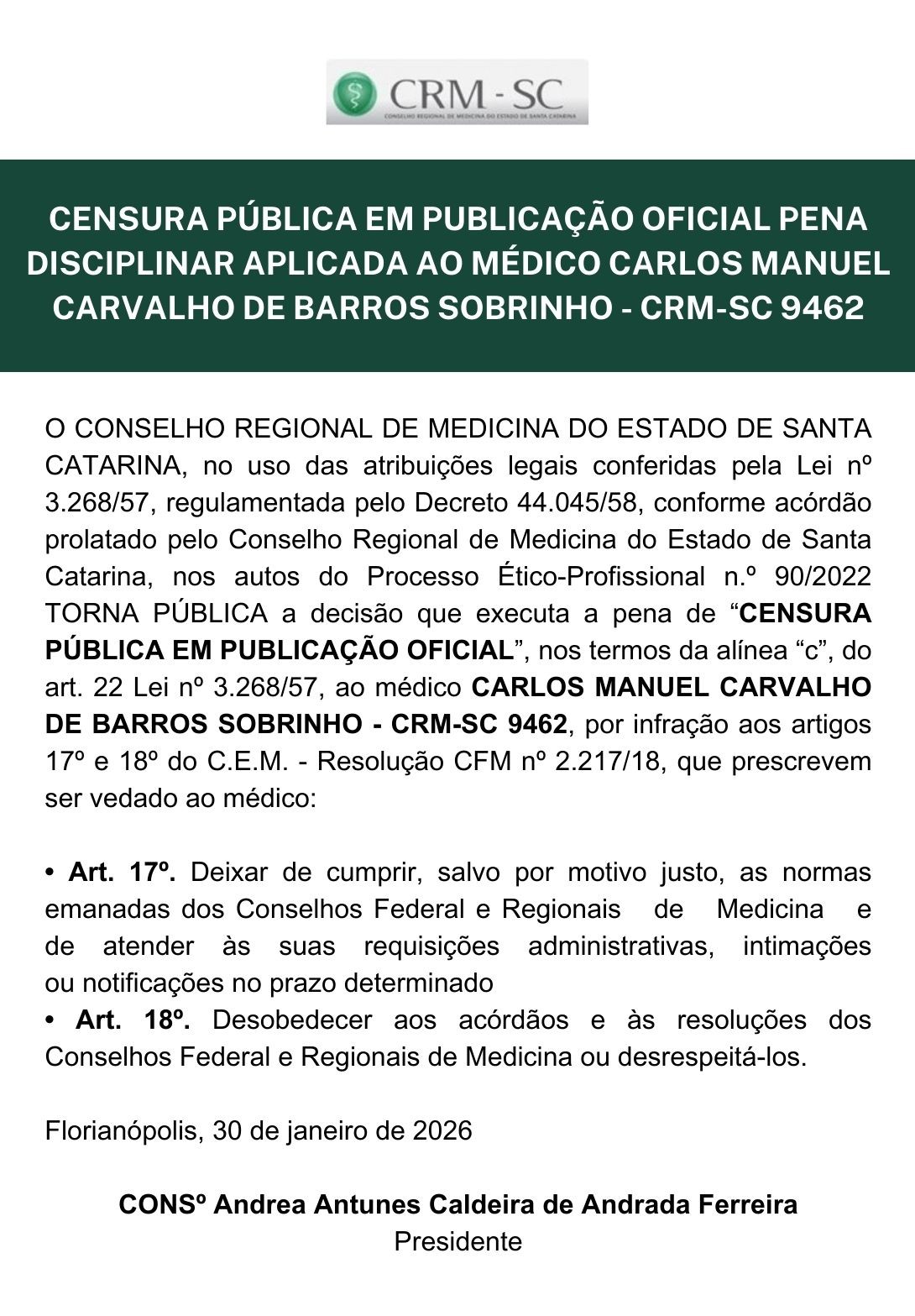 30/01/2026 | Censura Pública: DR. CARLOS MANUEL CARVALHO DE BARROS SOBRINHO – CRM-SC 9462