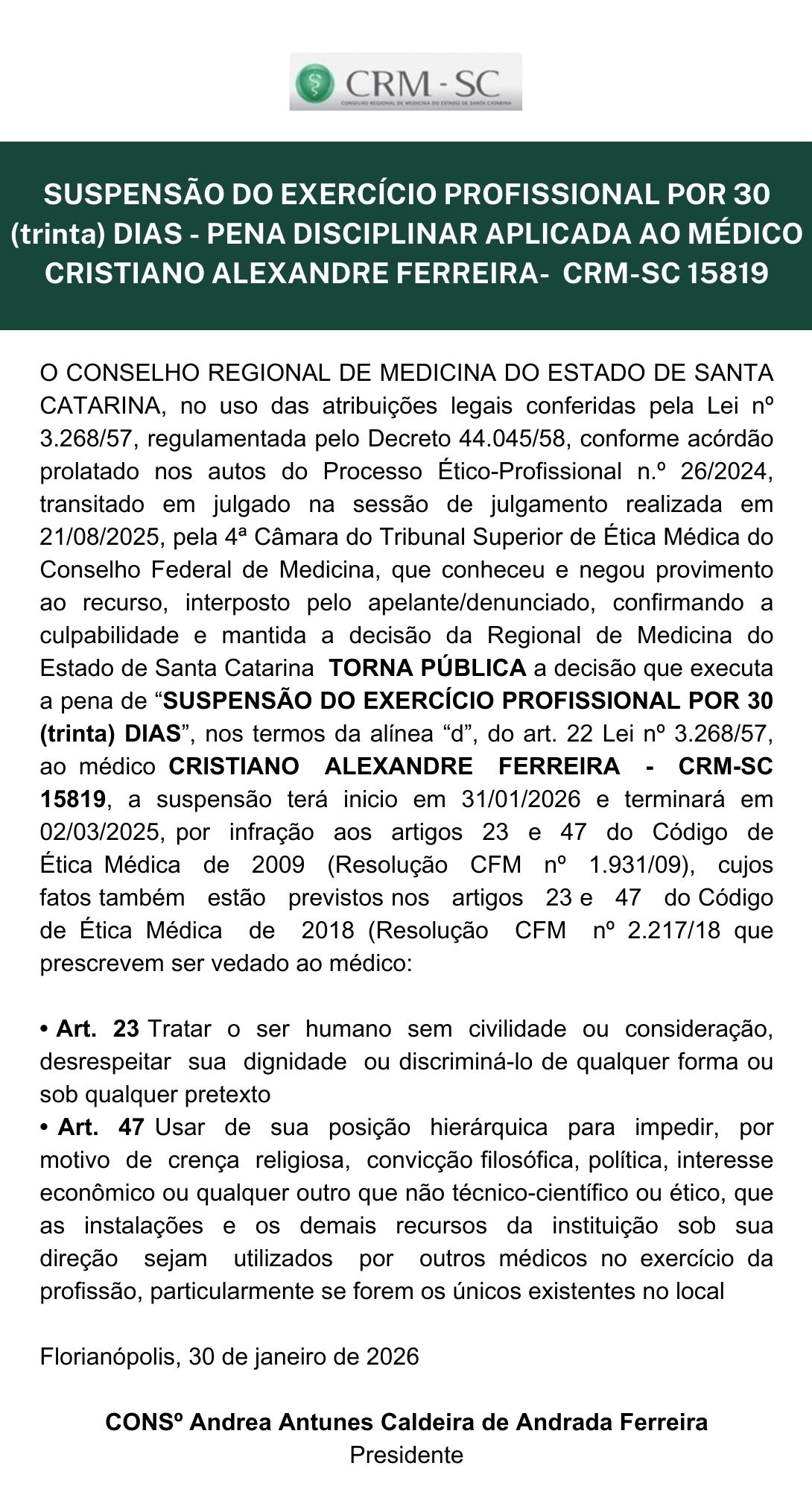 30/01/2026 | Censura Pública: DR. ANDRE RENZI MOTTA – CRM-SC 23959