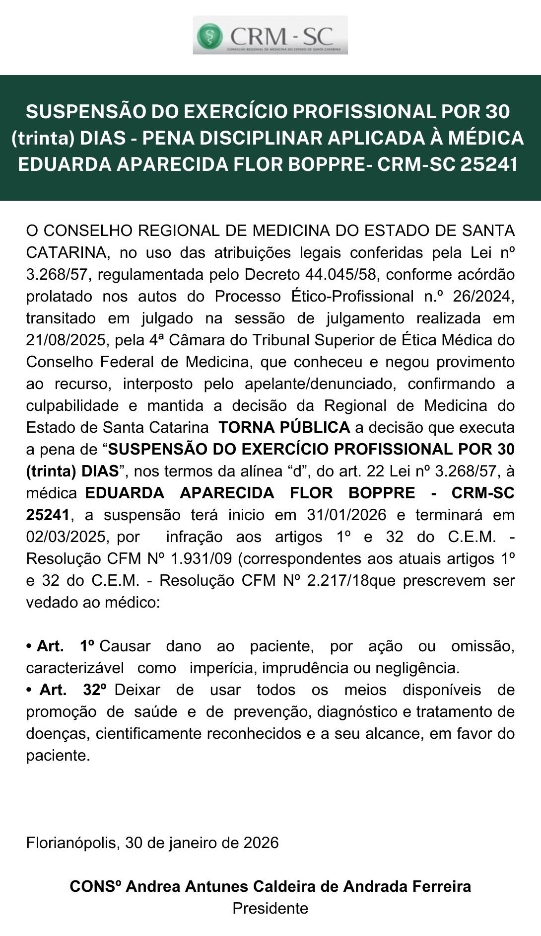 30/01/2026 | Suspensão do Exercício Profissional por 30 dias: DRA. EDUARDA APARECIDA FLOR BOPPRE – CRM-SC 25241