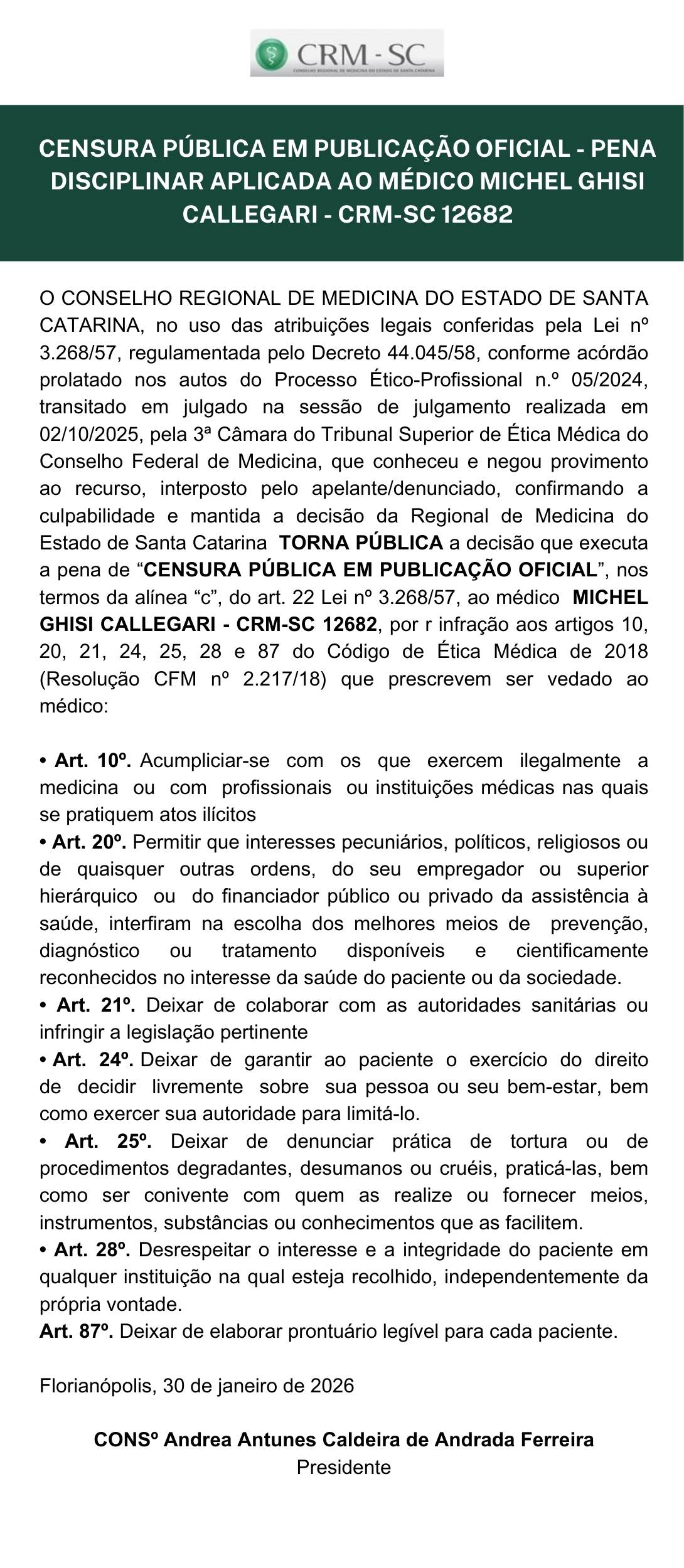 30/01/2026 | Censura Pública: DR. MICHEL GHISI CALLEGARI – CRM-SC 12682