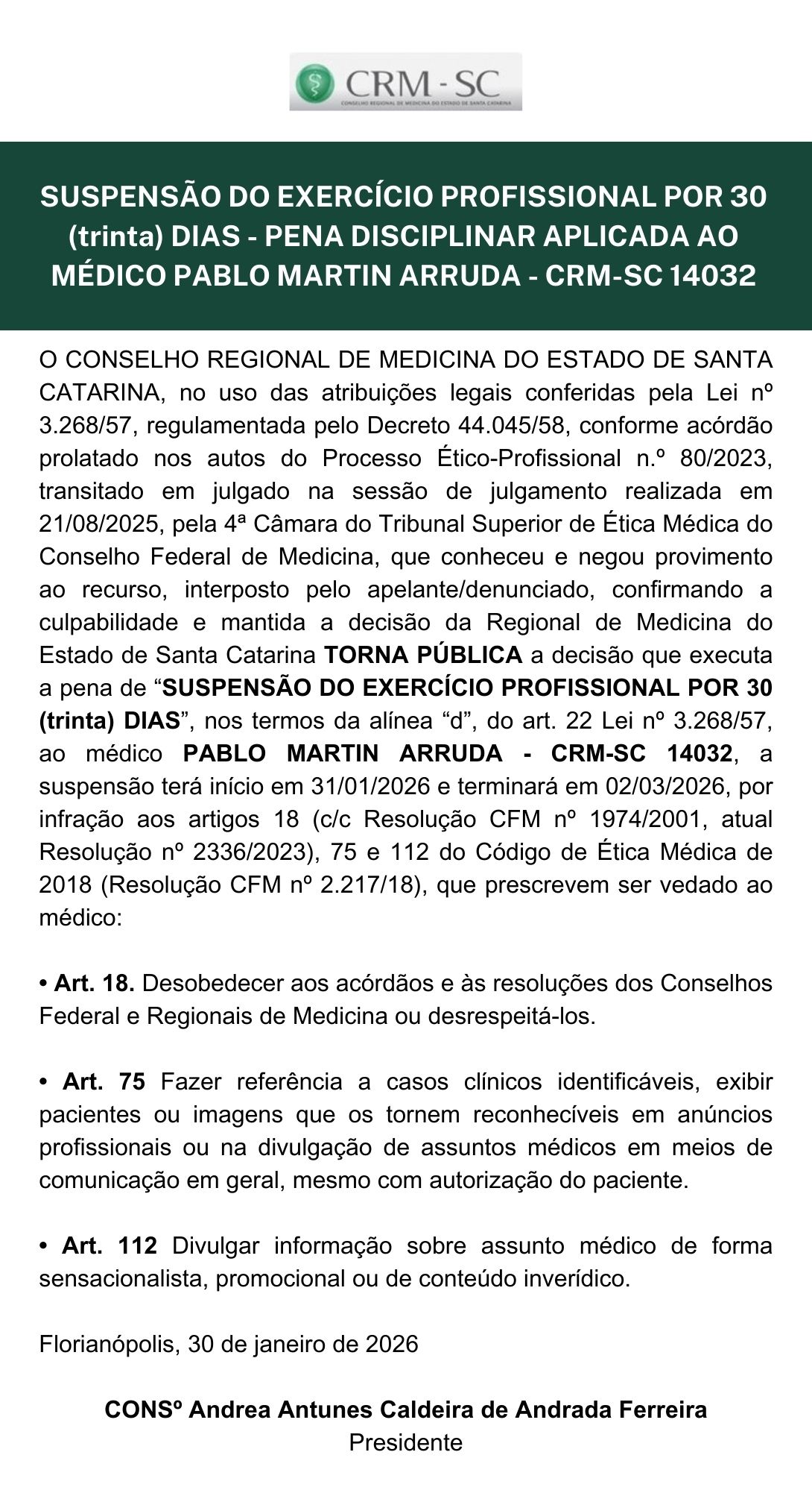 30/01/2026 | Suspensão do Exercício Profissional por 30 dias: DR. PABLO MARTIN ARRUDA – CRM-SC 14032