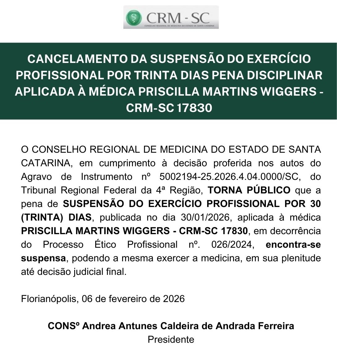 06/02/2026 | Cancelamento da Suspensão do Exercício Profissional por 30 dias: DRA. PRISCILLA MARTINS WIGGERS – CRM-SC 17830