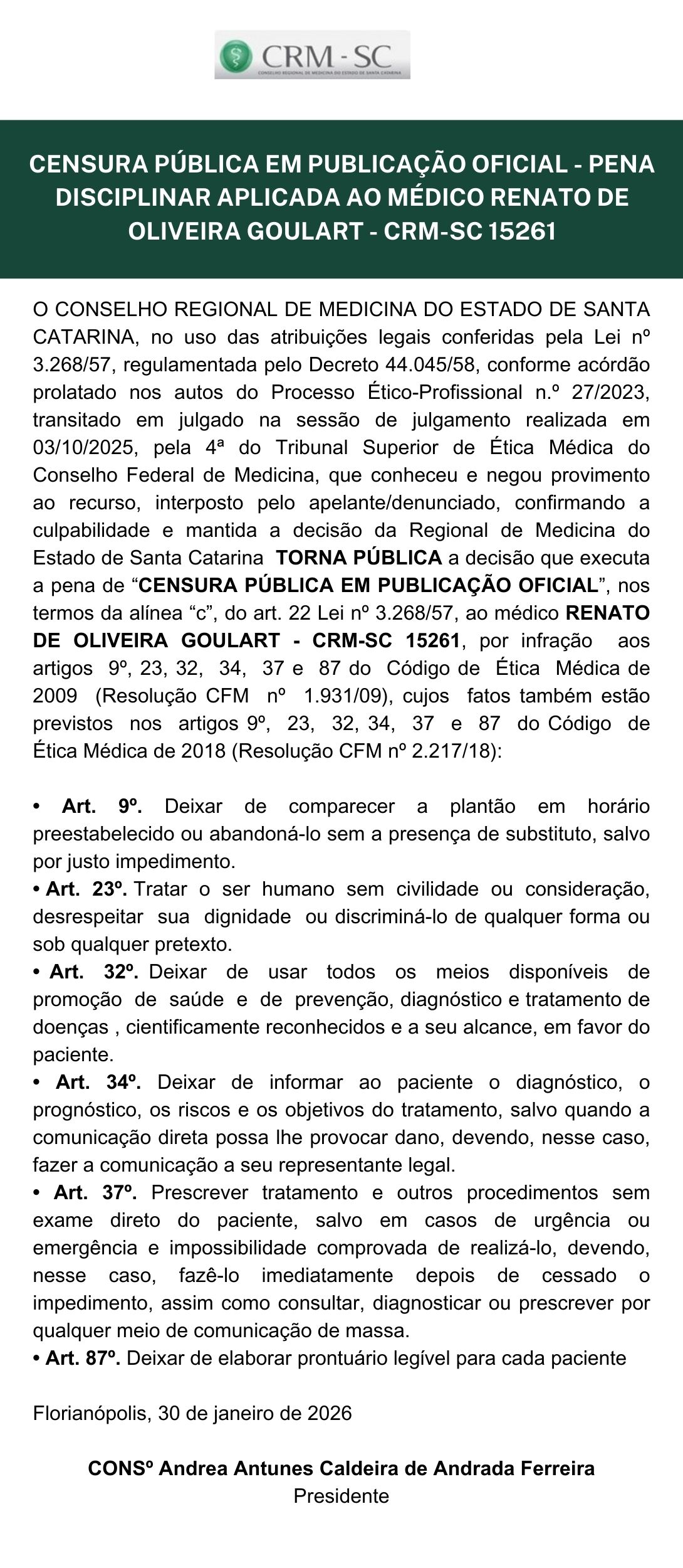 30/01/2026 | Censura Pública: DR. RENATO DE OLIVEIRA GOULART – CRM-SC 15261