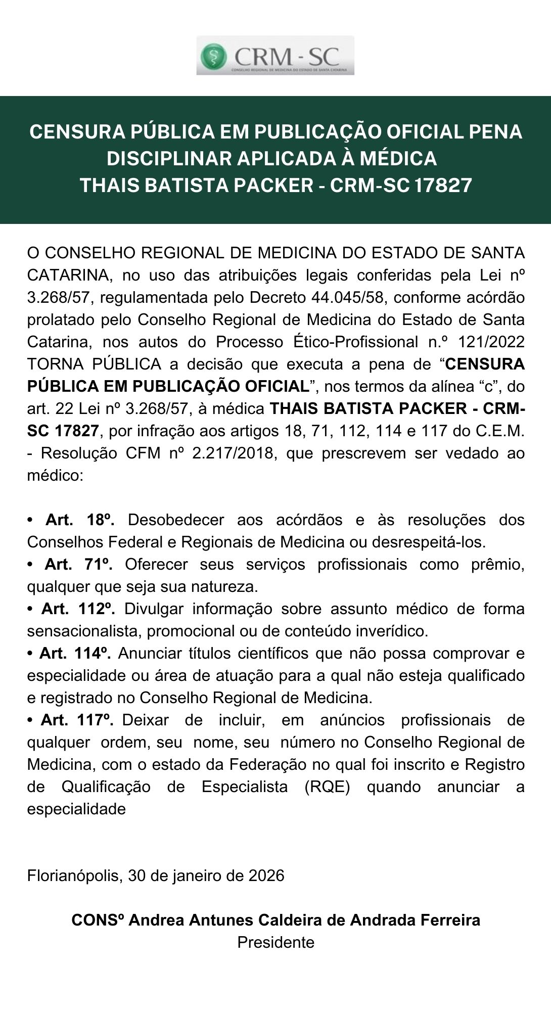 30/01/2026 | Censura Pública: DRA. THAIS BATISTA PACKER – CRM-SC 17827